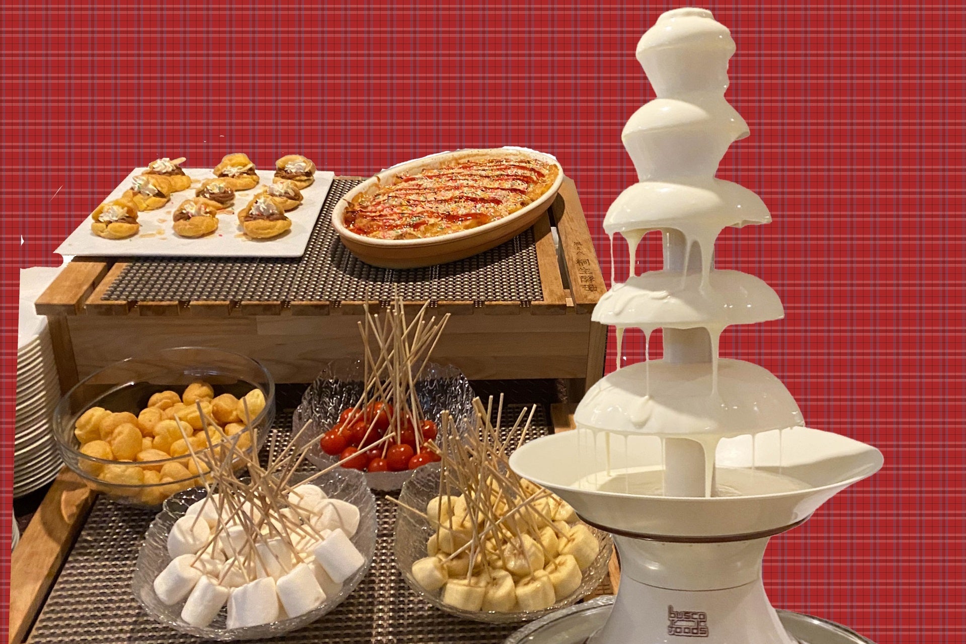 今回ご提供のホワイトチョコレートフォンデュはマシュマロやミニシュー、フルーツと共にご夕食時のビュッフェにてお愉しみいただけます。