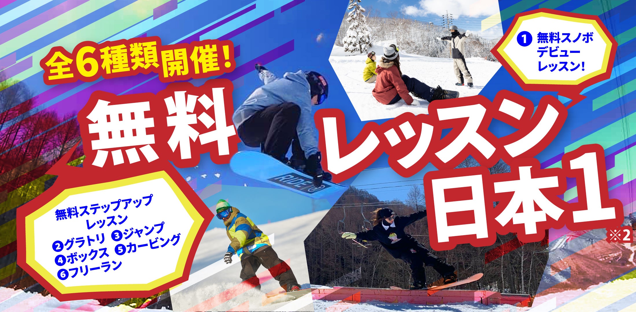 レッスン内容は「カービング・グラトリ・パーク(ボックス)・パーク(ジャンプ)フリーラン」の日替わり無料レッスンとなり、従来の「無料スノボデビューレッスン」と合わせ、無料レッスンの開催種類数においても日本一を達成いたしました。