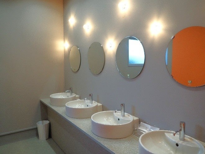 パウダールーム内はオレンジ色を基調として、明るい空間を演出し、メイク直しや身支度が快適にできる洗面スペースや座ってゆったりと整えられるスペースをご用意しております。室内には、ReFaのドライヤーやヘアアイロン、メイクに必要なアメニティ類も取り揃えております。