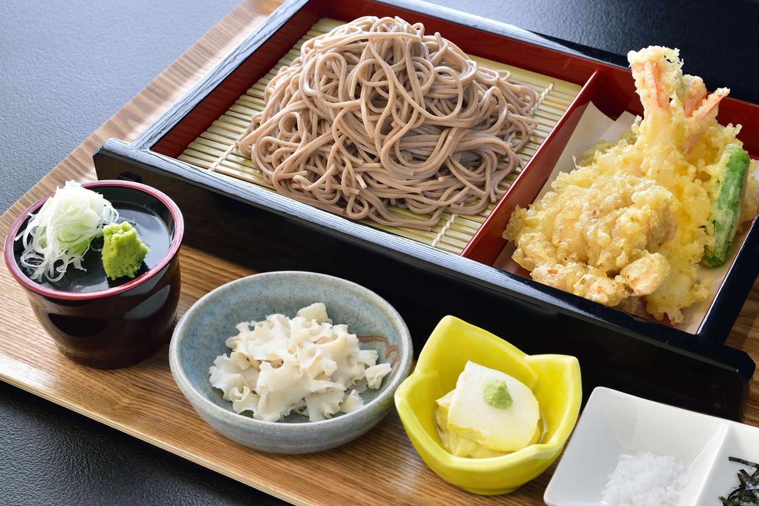 メイン料理:DDハナビラの天ぷらそば 特典:村杉温泉「ラジウム大露天風呂」での日帰り入浴