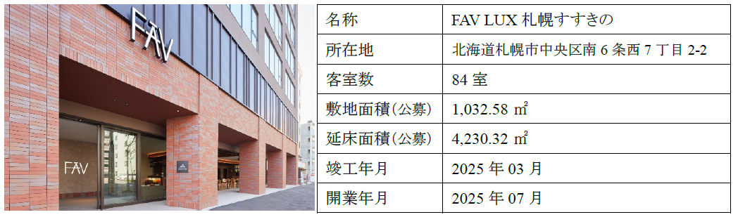 霞ヶ関キャピタル株式会社(本社:東京都千代田区、代表取締役社長CEO:河本幸士郎、以下「当社」)は、このたび当社が企画・開発をおこなった『FAV LUX札幌すすきの』(以下、「本物件」)が、当社連結子会社(以下、「子会社」)より売却され、運用フェーズに移行したことを下記のとおりお知らせいたします。