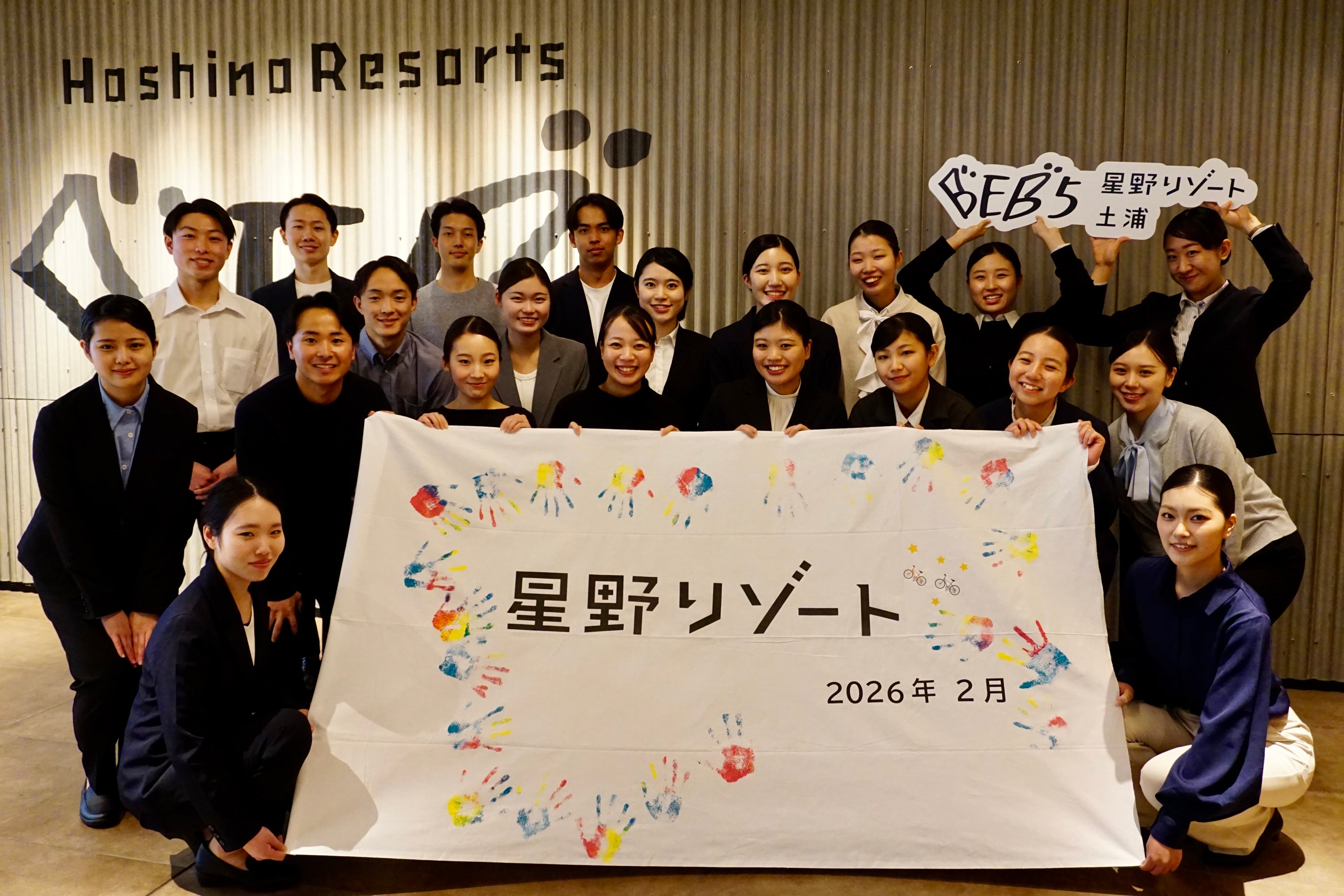 「旅を楽しくする」をテーマに国内外で75施設を運営する星野リゾートは、2026年2月4日に入社式を実施しました。この冬には、21名の新入社員を迎え、茨城県にある「BEB5土浦 by 星野リゾート(ベブ)」で、新入社員研修「Warm-up Camp」と入社式「契りの会」を行いました。研修期間では、ホテル運営や組織の価値観を学び、最終日に行われた入社式では、これから働く決意を込めて、手のひらに絵の具をひたし、手形を押す「契りの手形」を結びました。この後、全国各地の施設に着任します。