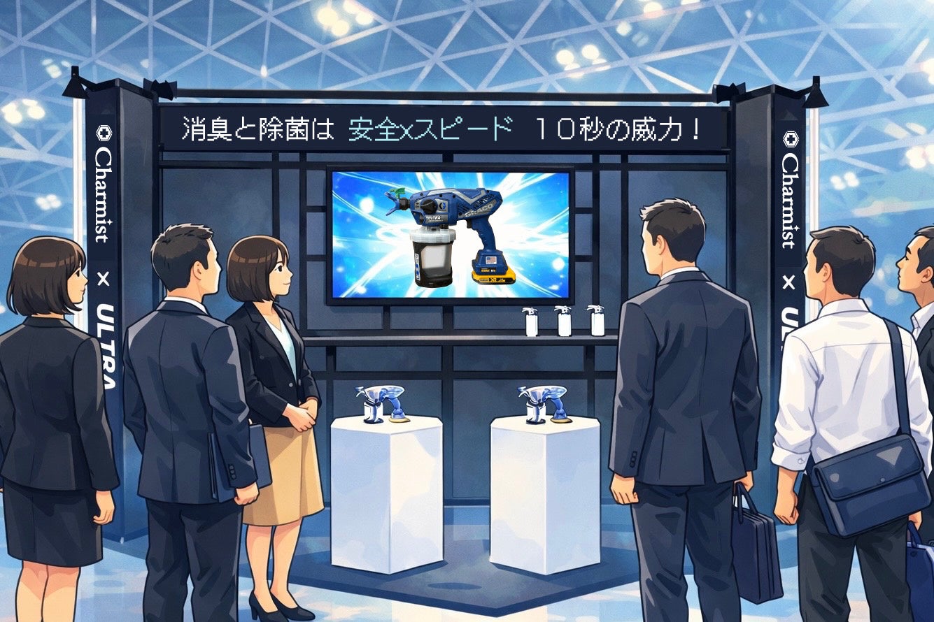 本展示では、除菌消臭剤「チャーミスト」と米国グラコ社製コードレス電動スプレーヤー「ULTRA MAX」を組み合わせた、高稼働ホテル・旅館のための清掃現場に適した客室除菌消臭ソリューションを紹介します。