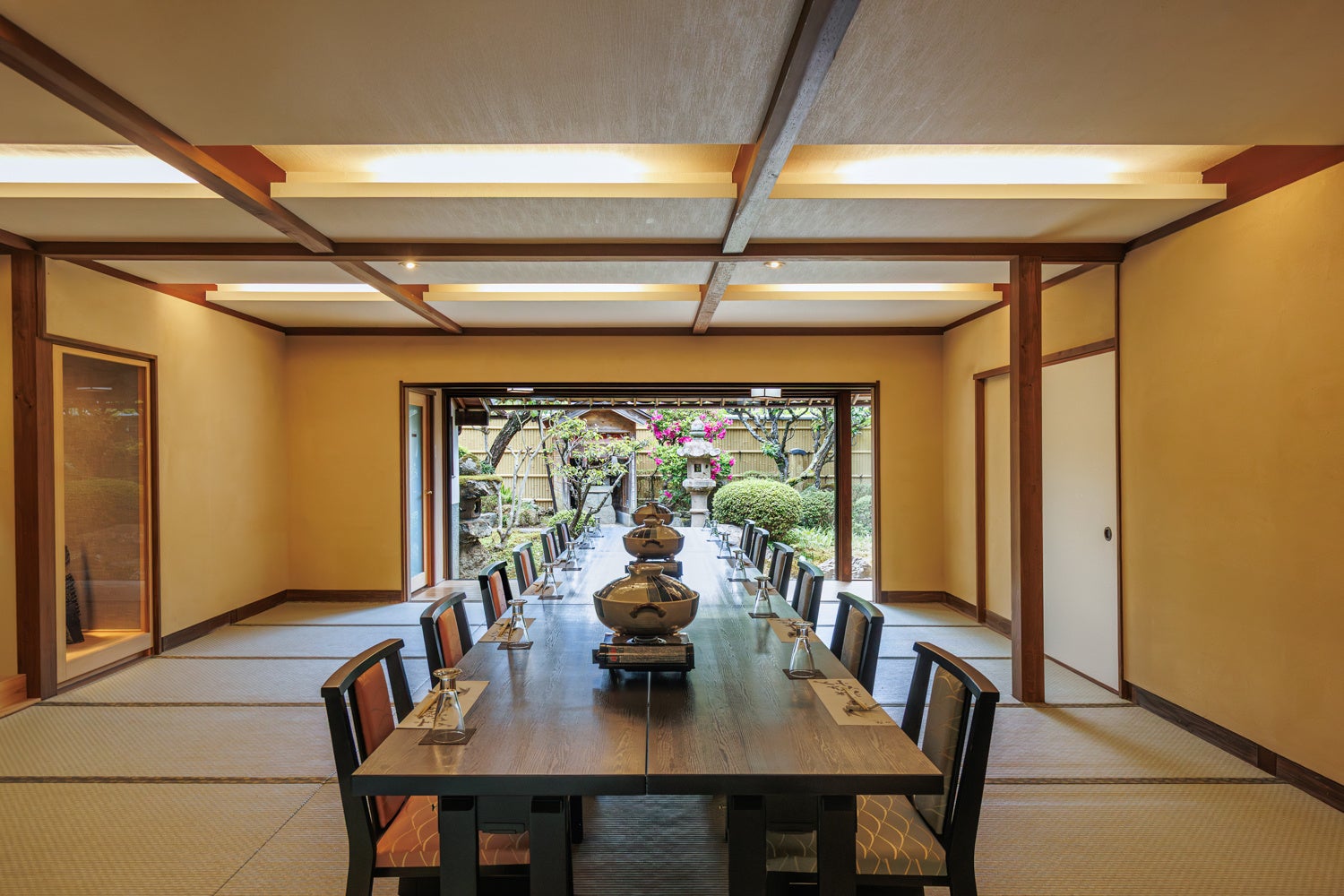 中庭と裏庭の両方を同時にご覧いただけるお部屋です。一番人気のお部屋でお顔合わせやご結納、ご接待まで幅広くご活用いただけます。