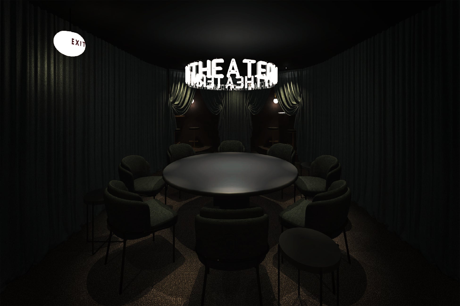 参加者全員が「物語の登場人物となれる劇場」を実現するため、360°を囲む緞帳(どんちょう)を思わせるカーテン、中央テーブルのプロジェクションマッピング、光と色の照明演出、8.1chサラウンド音響で、物語への没入をより深めます。