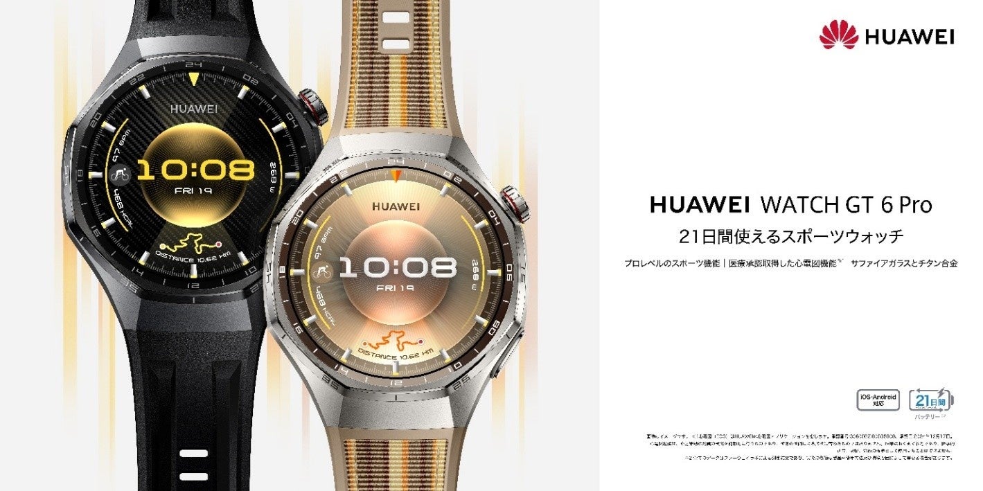 『HUAWEI WATCH GT 6 Pro』『HUAWEI WATCH GT 6』『HONMA×HUAWEI WATCH GT 6 Pro』からなる『HUAWEI WATCH GT 6シリーズ』は、長時間のアクティビティでも安心して使えるロングバッテリーが特長です。46mmモデルは常温環境下の通常使用で約21日間、GPS連続使用で約40時間使用可能です。41mmモデルは通常使用で約14日、GPS連続使用で約25時間使用できます。