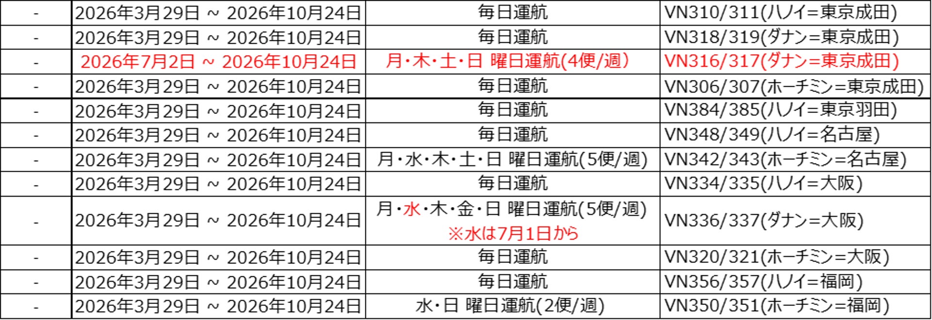 ベトナム航空(日本支社 所在地:東京都千代田区、総支配人:ゴー・シー・アイン)は、2026年3月29日(日)から2026年10月24日(土)までの夏季運航スケジュールを発表しました。