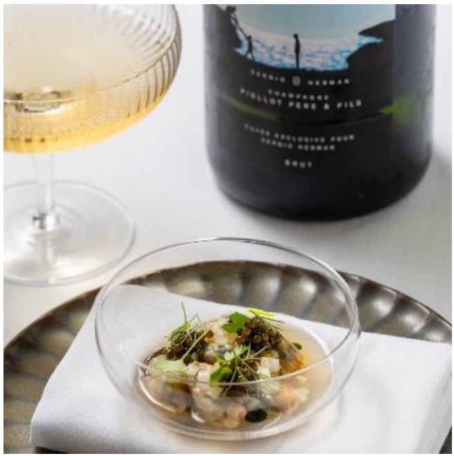 「セルジオとともに旅をするような体験」を象徴するコースの幕開けは、彼のDNAを体現する一皿「冷製ムール貝」と、オリジナルシャンパーニュのペアリングから。故郷ゼーラントの海を思わせるムール貝の凝縮した旨みを、華やかで伸びやかなシャンパーニュが包み込み、旅の始まりを印象づけます。