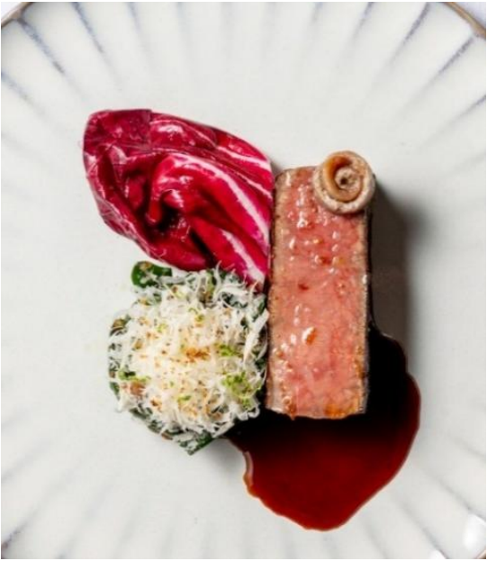 ◆国産あか牛 ホウレン草アンチョビ風味 ラディッキオ クリスピーポレンタ サラワクペッパーのソース 熟成バルサミコ