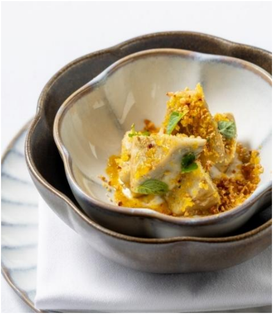 デザートの「四国レモンのコンフィ」は、ローマの伝統菓子に多用されるリコッタチーズをベースに、アブルッツォ州に馴染みのあるアーモンドアイスクリームにアカシアハチミツをまとわせ、爽やかなレモンとバジルのソースを添えてご提供。レモンコンフィの心地よい甘酸っぱさが全体を引き締め、コースの締めくくりにふさわしい清涼感を演出します。