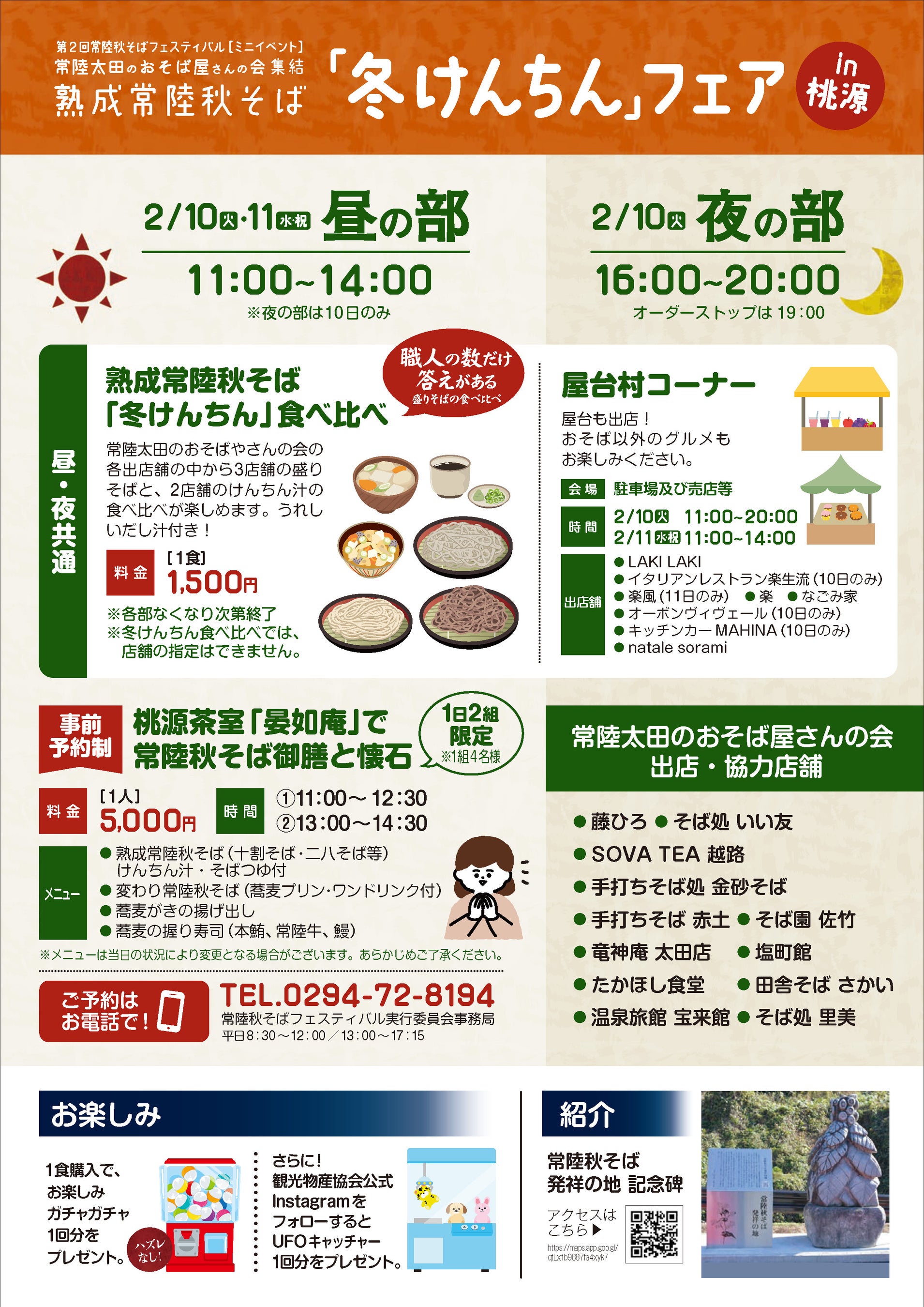 茨城県常陸太田市では、2月10日・11日、西山の里 桃源で常陸太田のおそば屋さんの会が集結し、盛りそばの食べ比べなどが楽しめる『熟成常陸秋そば「冬けんちん」フェアin桃源』を開催します。