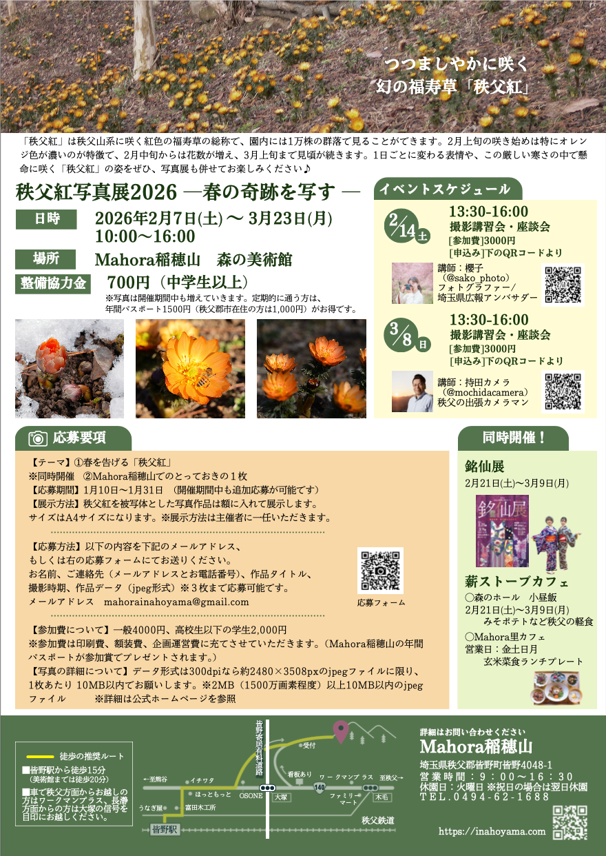 秩父紅写真展〜春の奇跡を写す〜 -Mahora稲穂山主催、2026年2月7日(土)〜3月23日(月)