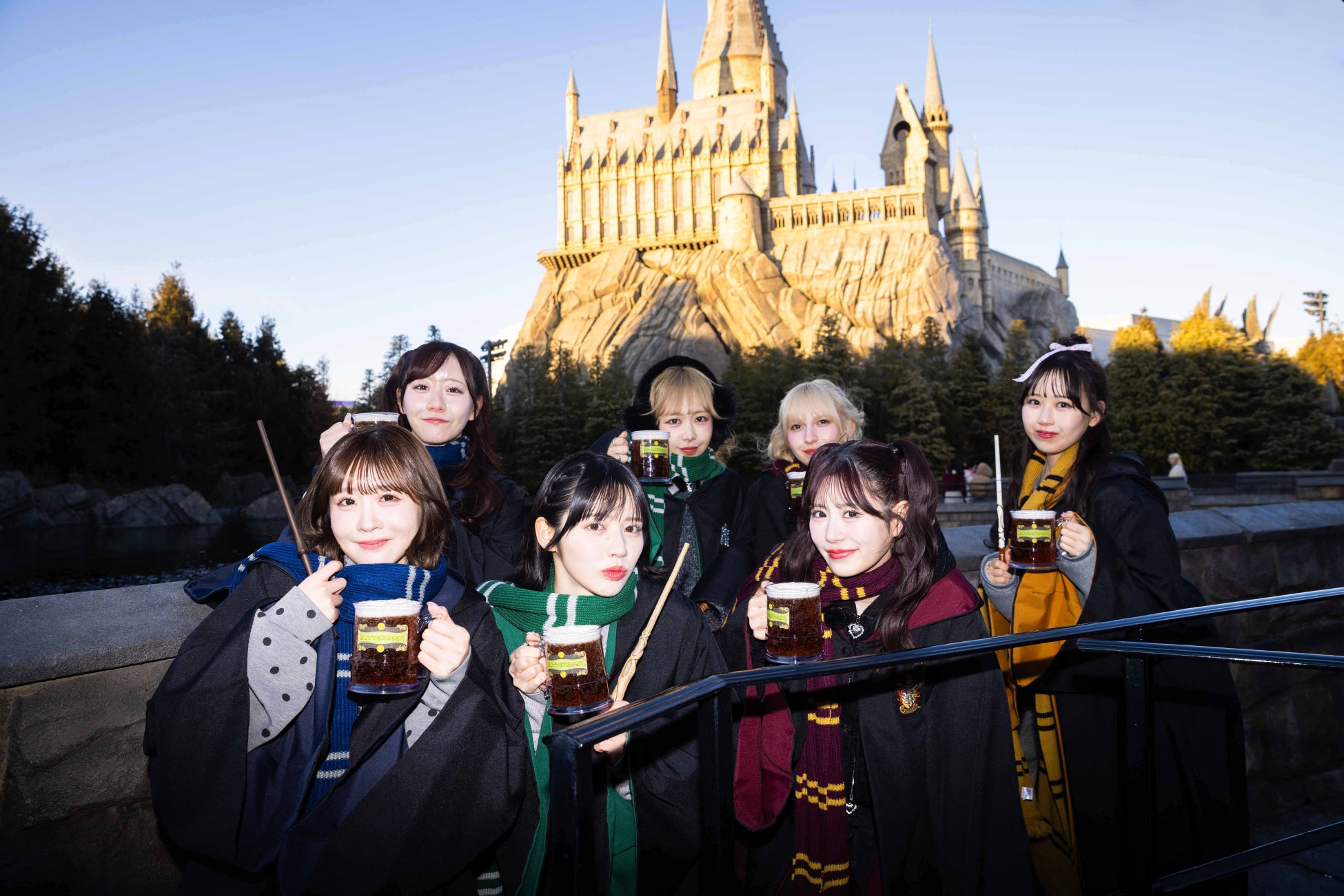 「FRUITS ZIPPER」のメンバーは、ライブ後に春のパークを満喫しました。まず向かったのは『ミニオン・ハチャメチャ・ミッション ~大悪党への道~』。スタート直後からミニオンたちのハチャメチャに巻き込まれ、メンバーは口々に「楽しい!楽しい!」と声をあげて大興奮。ブラスターを構えて狙いを定め、撃って、壊して、ぶっ飛ばす爽快アクションにメンバー全員が夢中になりました。続いて訪れた『イーブル・イーツ』では、背徳感たっぷりの『大悪党のためのドーナツ・バーガー ~BBQ ポーク&ベーコン~』を食して「甘じょっぱい!最高!」と悪党になった気分でニンマリ。『ウィザーディング・ワールド・オブ・ハリー・ポッター™』でホグズミード村™に到着したメンバーは、名物のバタービール™で乾杯!ふわふわの泡が口元につき、自然とできた“ひげ”をメンバー同士で見せ合い、「めっちゃ(泡が)ついてる」と笑いあうなど、特別な時間を満喫しました。ほっとひと息ついたあとは、ワンドマジックに挑戦。「メテオロジンクス™」を唱えると、雪をふらせる魔法をかけることに成功!「えっ、(雪が)めっちゃふってきた!」「魔法をかけれた!」とメンバー全員が大興奮!笑顔と歓声が絶えない特別な時間となりました。