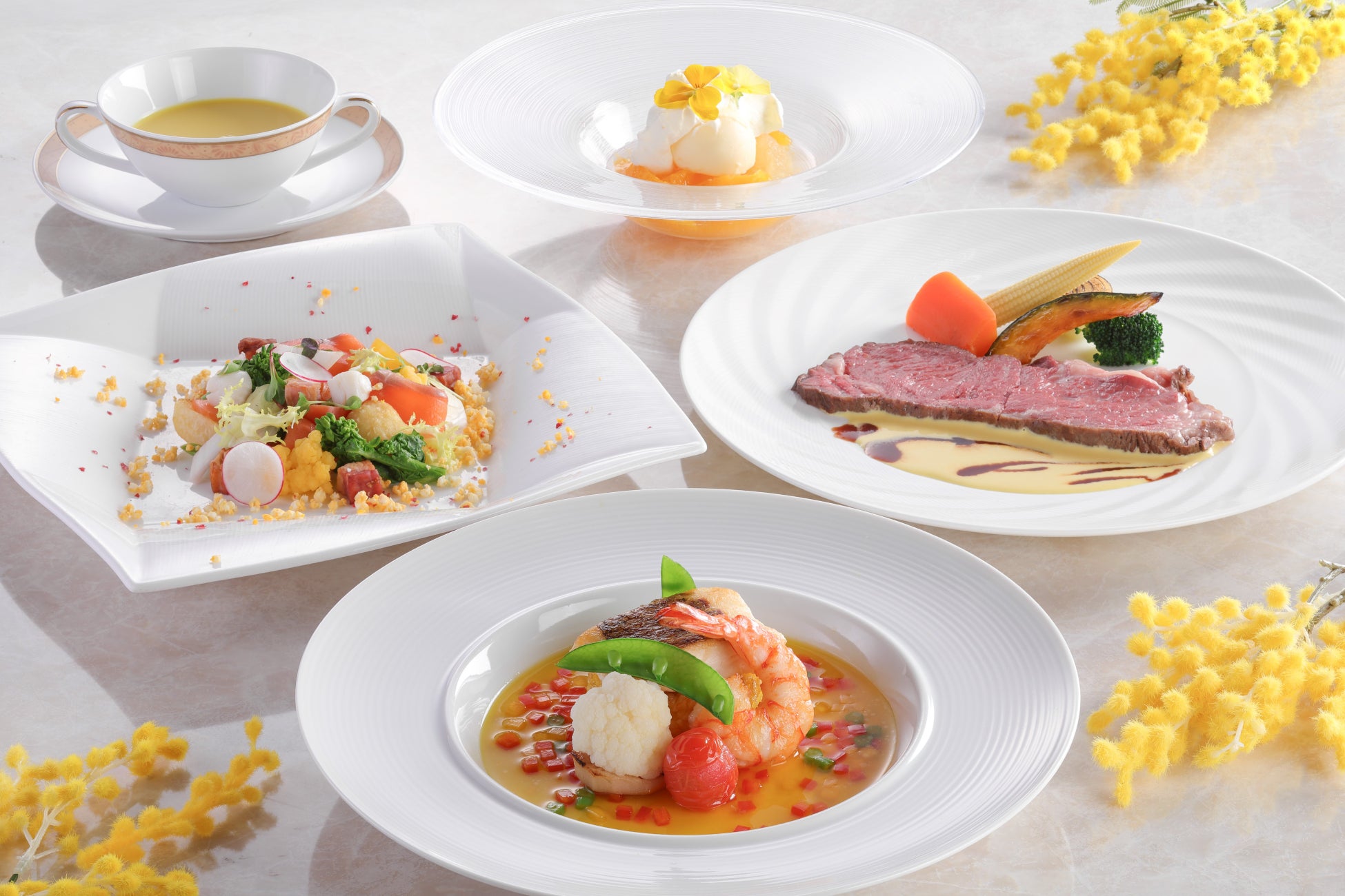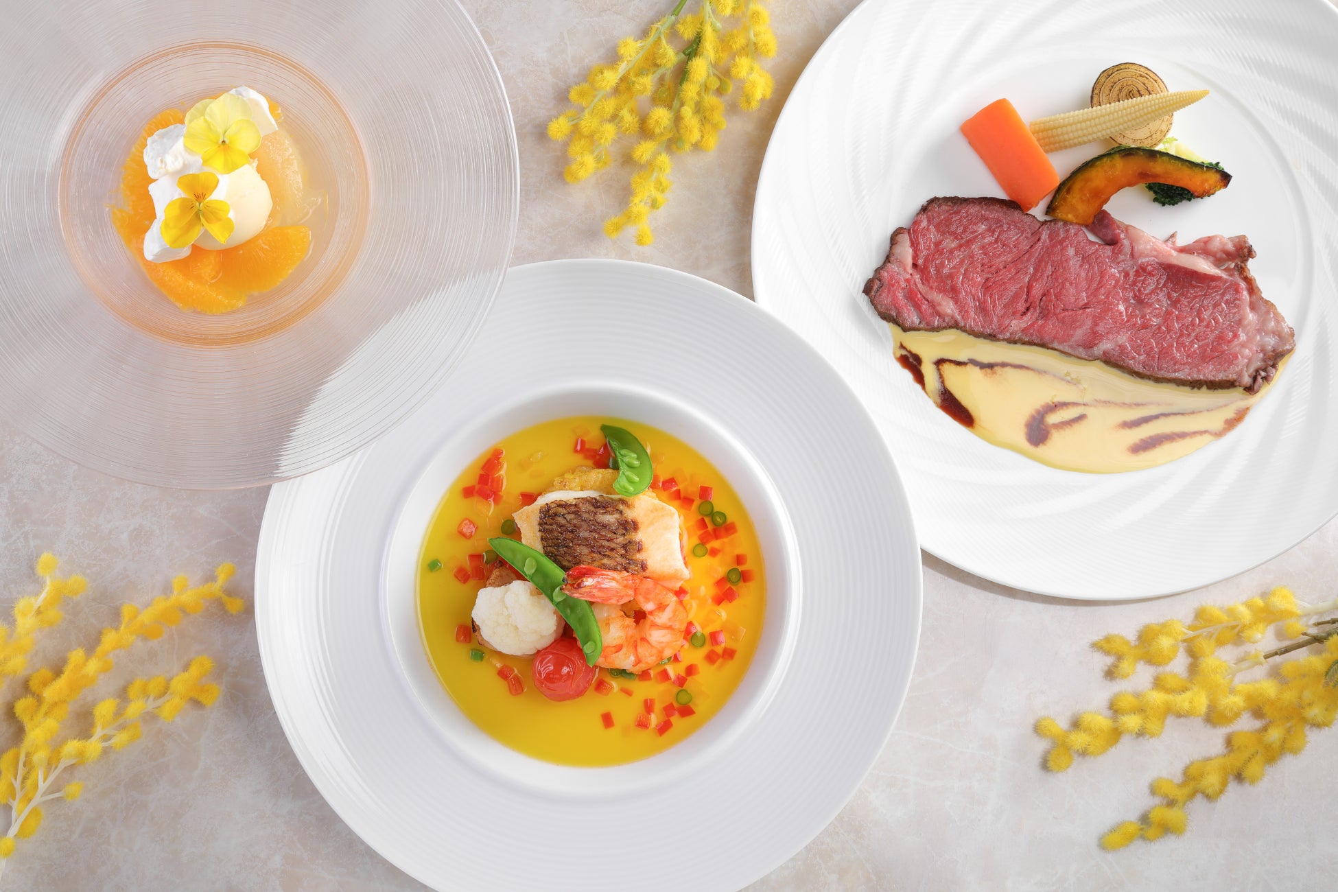 レストラン&ラウンジ・バー eu(ゆう)では、華やかなイエローに彩られた創作フレンチコース「ミモザランチ」をリニューアルし、ご用意します。カフェ&グルメショップ カフェベルでは、「甘夏のブリオッシュ」が新登場。