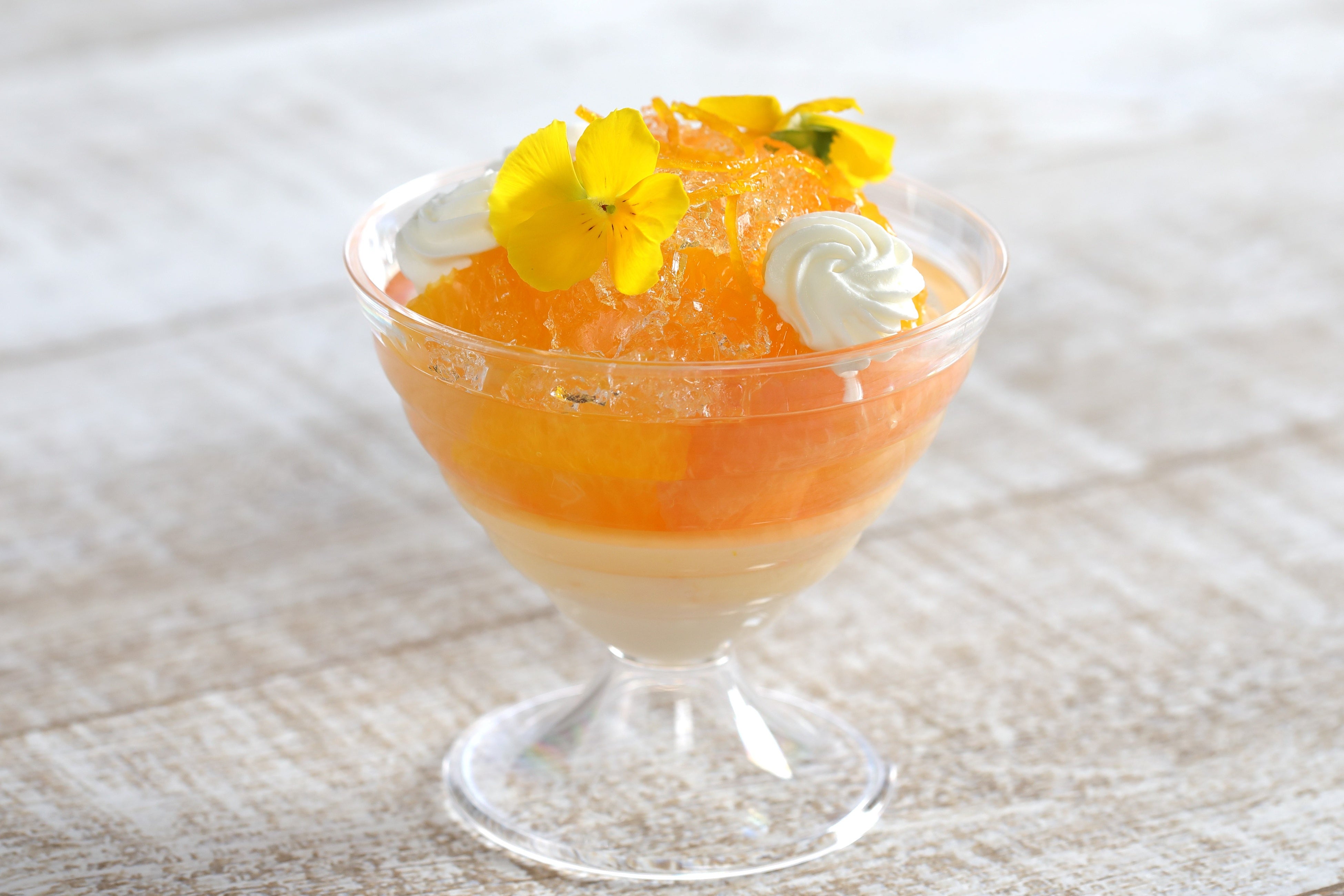 パンナコッタ、みかんのブリュレ、オレンジやグレープフルーツをたっぷり入れたカルダモンフレーバーのジュレを層にし、ビタミンカラーのエディブルフラワーを飾りました。
