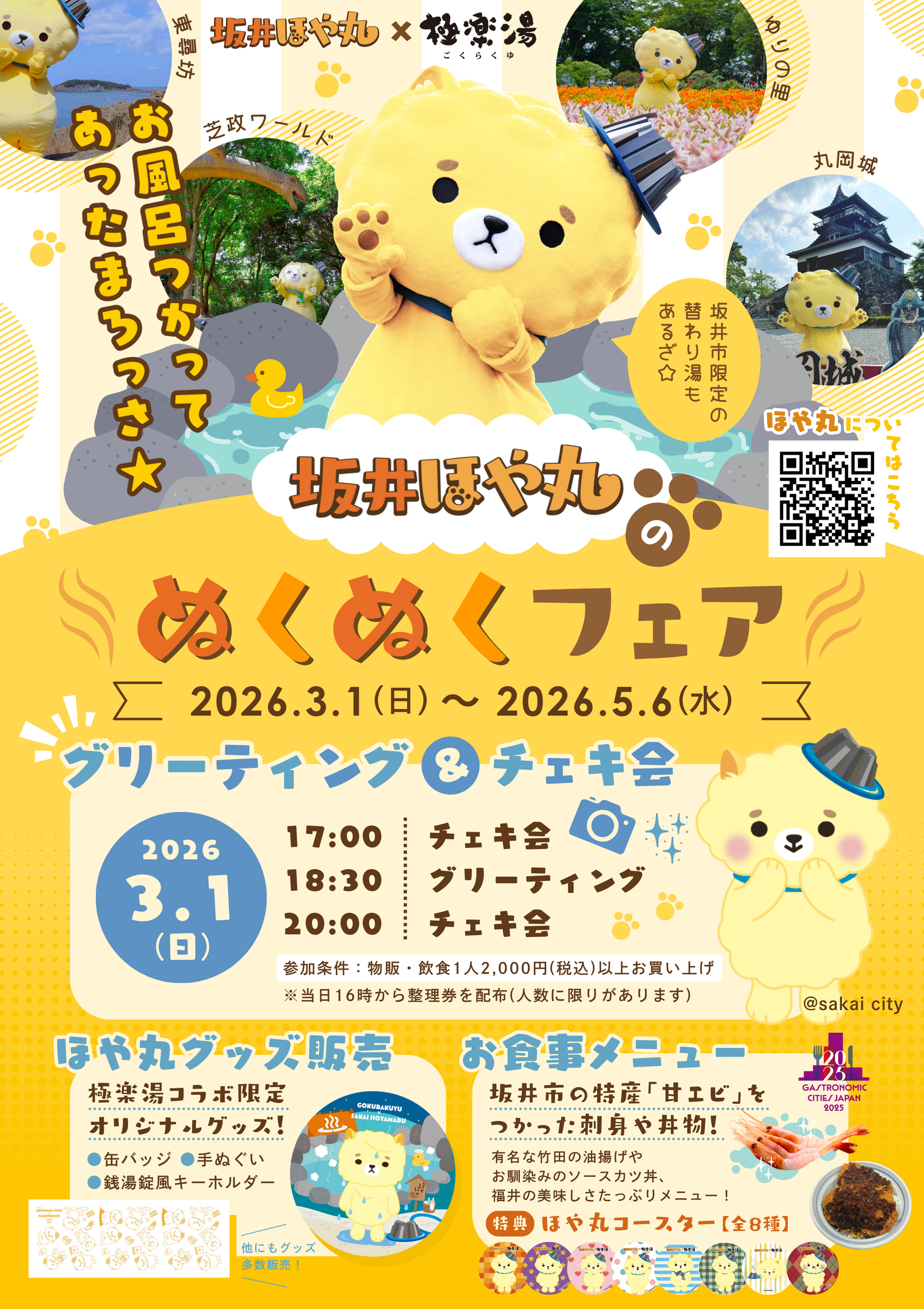 【福井県坂井市×極楽湯】東尋坊をイメージした替わり湯や、特産品をつかったメニューで坂井市をPR!坂井ほや丸の限定コラボグッズやノベルティ、チェキ会も実施!坂井ほや丸のぬくぬくフェア開催