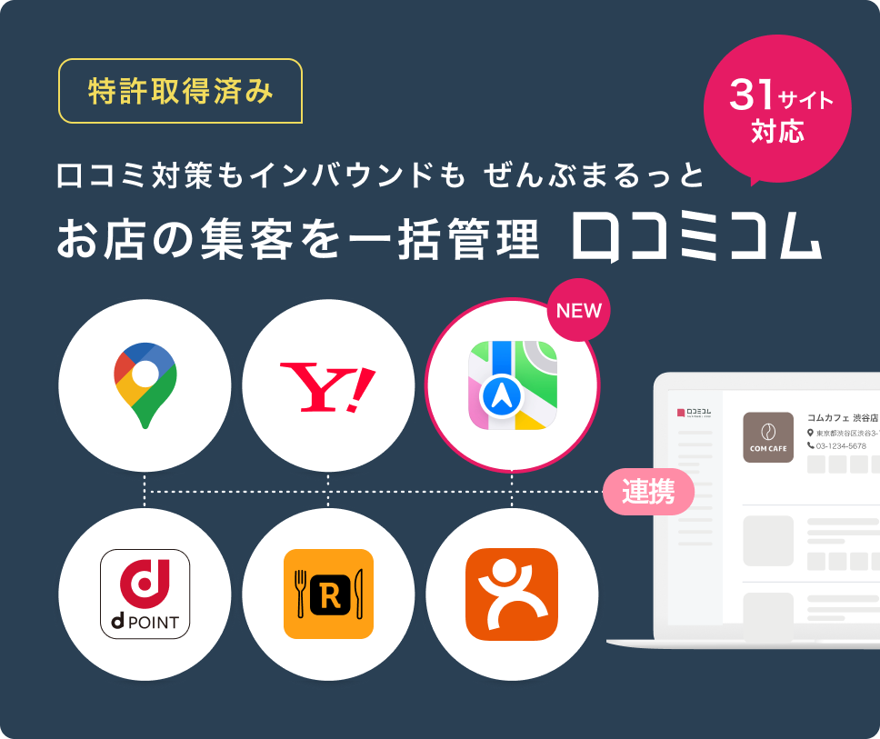 口コミコムは、国内外の口コミサイトを”もっと”売上に変える「店舗向け集客一元化プラットフォーム」です。