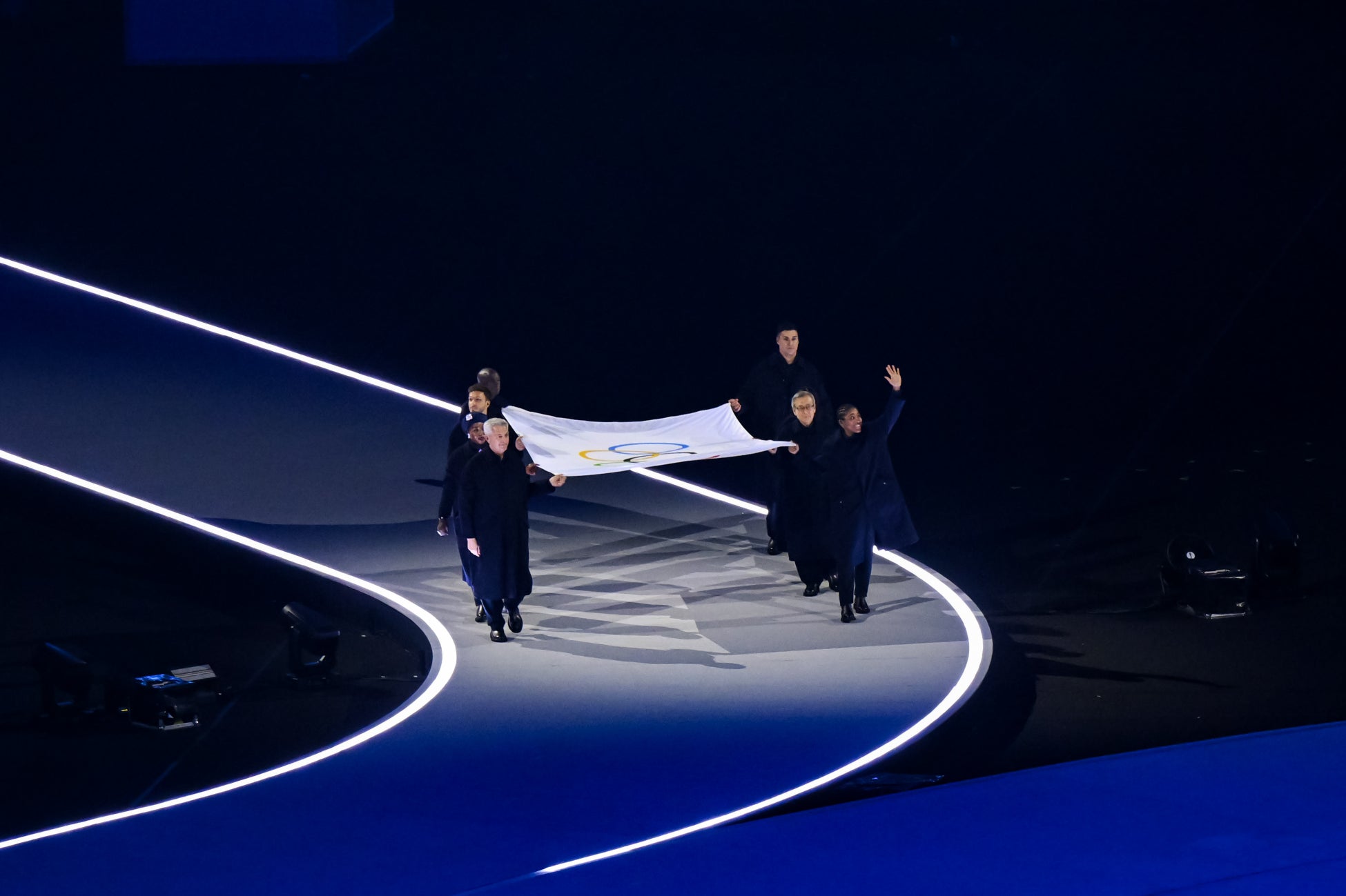 式典の最終章では、レベッカ・アンドラーデ、エリウド・キプチョゲ、シンディ・ンガンバ、ピタ・タウファトフアといった4名のアスリートに加え、マリアム・ブカル・ハッサン、ニコロ・ゴヴォーニ、フィリッポ・グランディ、秋葉忠利 前広島市長が、ジョルジオ アルマーニ 25/26秋冬コレクションを着用し、オリンピック旗をメインステージへと運びました。