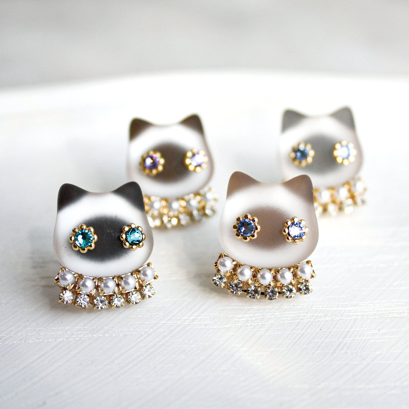 キラキラビジューをあしらった、手描きの柄の猫たちのアクセサリーです。