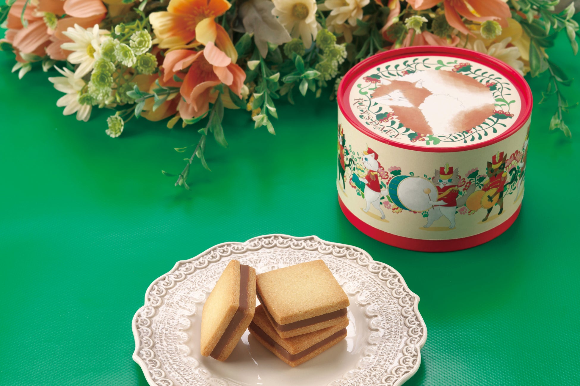 サクサク食感のクッキーでミルクチョコレートをサンドしました。お昼寝している猫が夢の中でパレードしている可愛らしいパッケージ。1箱6個入。