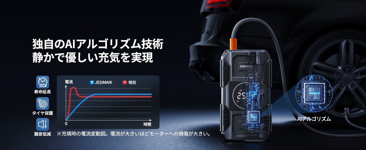 同様の制御ロジックは、エアコンプレッサー機能にも応用されています。高圧エアの瞬間的な吹き込みを抑制することで、急激な内圧変化によるバルブからのエア漏れやチューブへのダメージ、最悪の場合のバーストリスクを低減し、より安全で安心な充填作業を実現します。