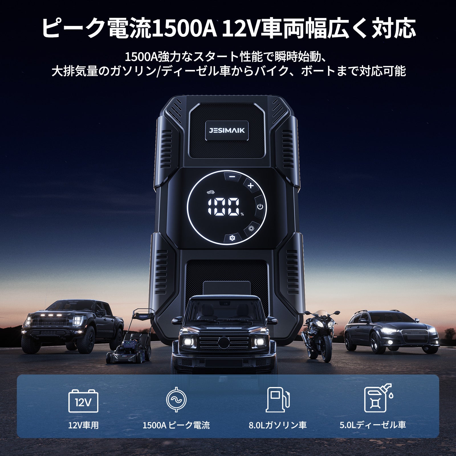 バッテリー上がりはもちろん、経年劣化や寒冷環境下でも安定した始動性能を発揮し、ガソリン車8.0L以下、ディーゼル車5.0L以下に対応。さらに、バイクや芝刈り機などの小型エンジン機器まで、幅広くカバーします。