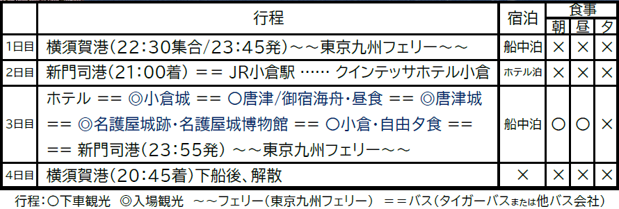 東京九州フェリー往復乗船代(基本:ツーリストA)・宿泊代(1泊)・食事代(朝1回・昼1回)・バス代(3日目)・入場料(小倉城・唐津城・名護屋城博物館)・消費税等諸税