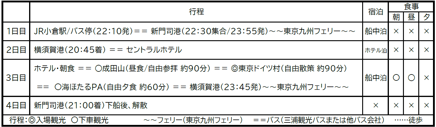 東京九州フェリー往復乗船代(基本:ツーリストA)・ホテル宿泊代(1泊)・食事代(朝1回・昼1回)・バス代(2・3日目)・入場料(東京ドイツ村)・消費税等諸税