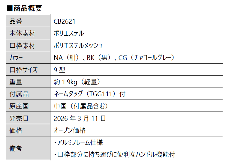 ブリヂストンスポーツ株式会社は、軽さと使いやすさにこだわった『軽量アルミフレームモデル(CB2621)』を3月11日より発売します。価格は全てオープンです。