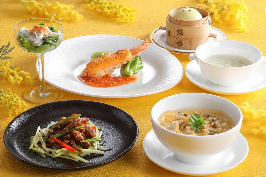 ミモザ仕立てのミニサラダやキャベツのポタージュ、牛肉と黄ニラのカキソース炒めなど、