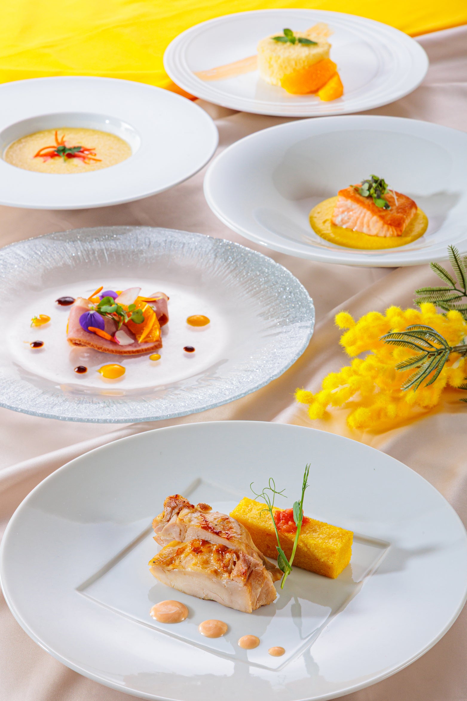 ミモザ仕立てのミニサラダやキャベツのポタージュ、牛肉と黄ニラのカキソース炒めなど、