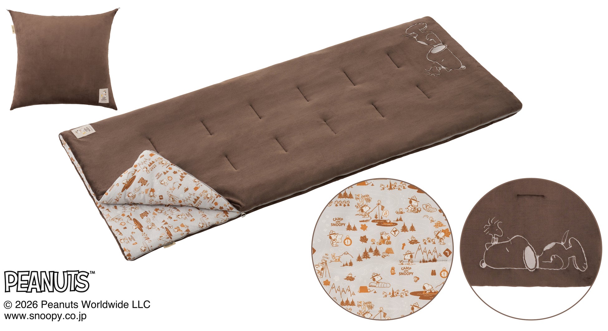 PEANUTSの仲間たちが描かれたLOGOSオリジナルデザインで、触り心地と保温性抜群なリバーシブルシュラフ「SNOOPY やわらかあったかシュラフ・0」を、キャンプや車中泊など様々なアウトドアシーンでぜひご活用ください。