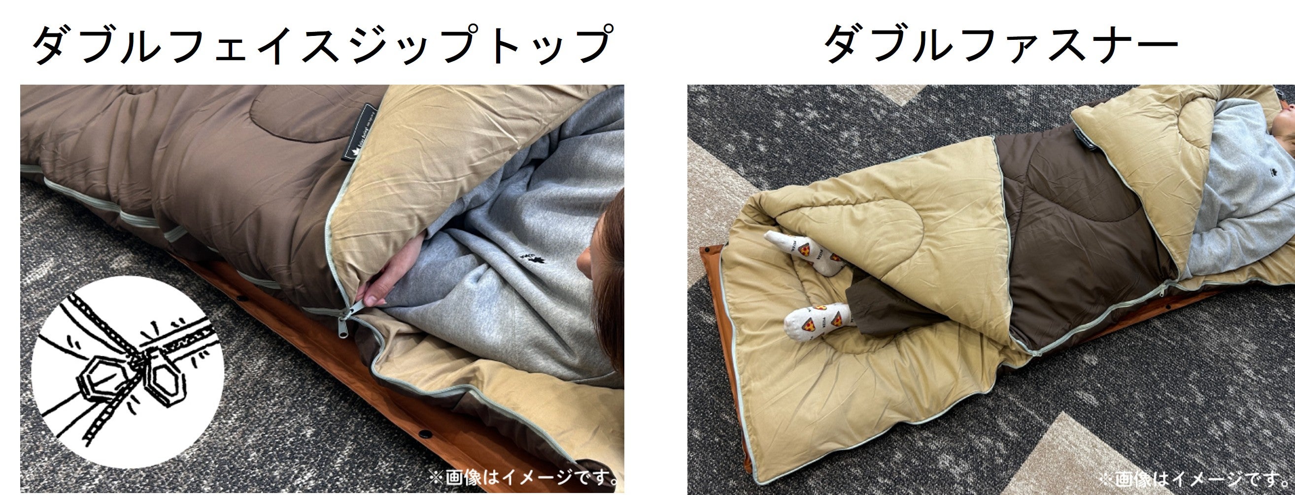 シュラフの開閉部分には、ダブルフェイスジップトップを採用し、寝袋の内側と外側どちらからでも開閉ができるほか、ジップスライダーを2個搭載したダブルファスナーを採用することで、腹部だけ閉じて使用するなどフレキシブルな温度調節が可能です。また、ファスナーを広げると敷布団、掛け布団としても活躍します。同じ寝袋同士であれば簡単に連結可能で、親子の添い寝もできるダブルサイズのシュラフに拡張でき、小さなお子様がいる家族にもおすすめです。