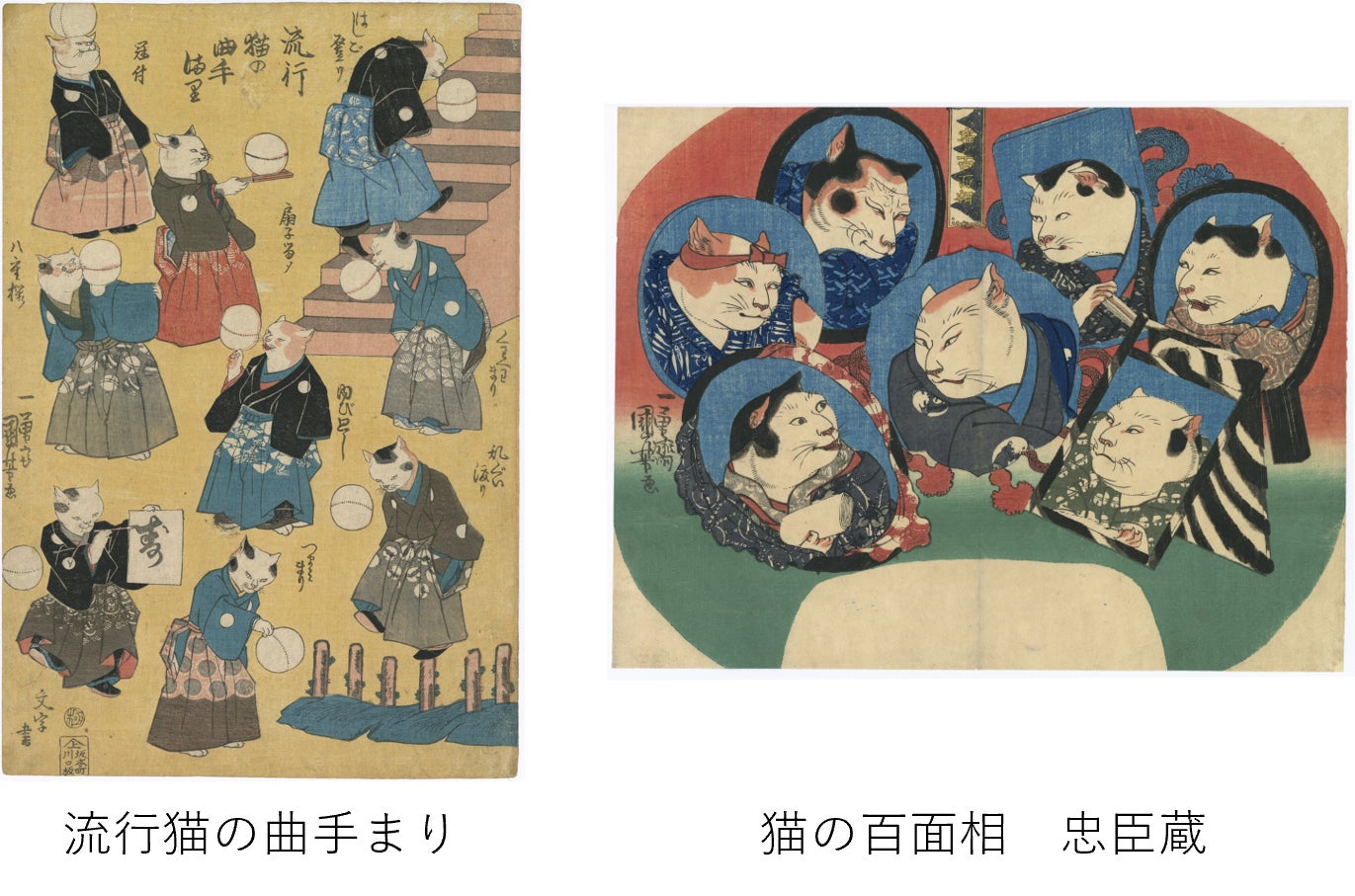 人気曲芸師「菊川国丸」の曲芸が流行したことから描かれた作品で、擬人化された猫が様々な曲てまりの芸を披露しています。着物にも注目してみると、鈴や小判など、猫に関連付けた柄が描かれています。