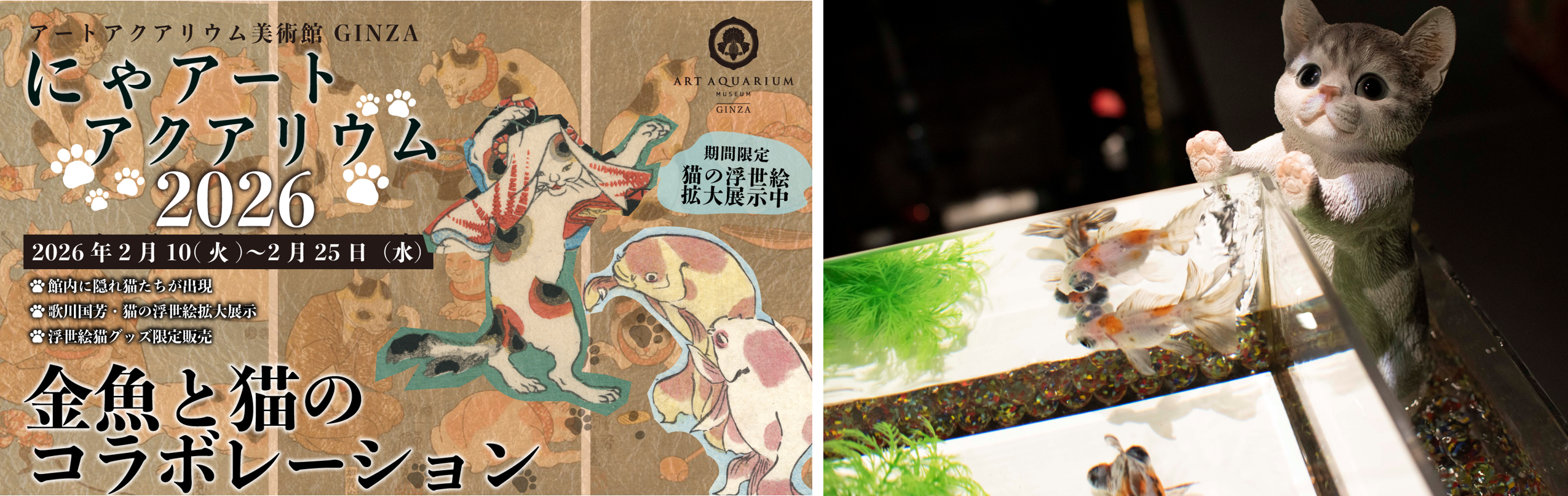 アートアクアリウム美術館 GINZA(所在地/銀座三越)では、2月22日の猫の日に合わせた館内ミニ企画を2月10日(火)~2月25日(水)の期間限定で開催いたします。作品展示エリアには猫が出現!さらに、浮世絵展示エリアでは、歌川国芳の“猫”浮世絵作品を展示します。