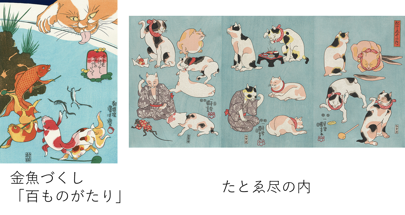 池の金魚とねこ / たとゑ尽の内 / 其まま地口 猫飼好五十三疋 / 猫の源氏 賢木 / おぼろ月猫の盛