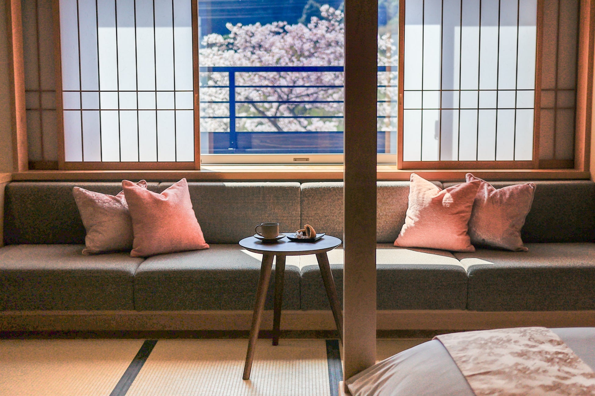 客室は桃色のクッションとベッドランナーなど、花見の気分を盛り上げてくれる特別な設えで準備します。窓の襖を開けると、音信川沿いの桜が目の前に広がり、プライベートな空間で桜を独り占めすることができます。さらに期間中は、大浴場の露天風呂を桜で彩ります。桜を愛でながら温泉に入浴するという贅沢なひとときを提供します。