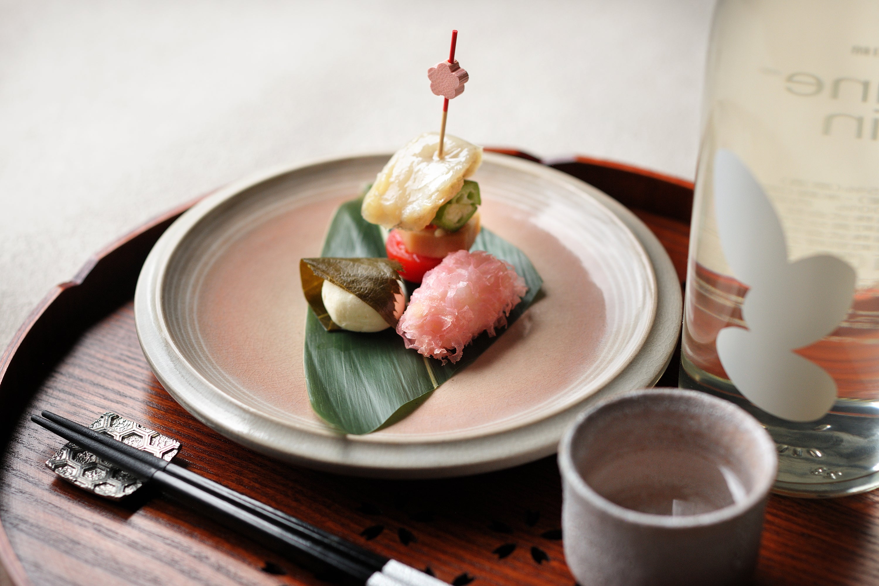 る「夜桜アペロ」を用意します。アペロを彩る肴には、山口県名産のふぐを使い、春をイメージした3種類のメニューを仕立てました。「ふぐの生ハム」、「ふぐの香煎揚げ」、「ふぐを練り込んだ雲丹とクリームチーズの桜餅」を、萩焼の器に盛り付けて提供します。また、花見酒として、ふぐの淡白な味わいと相性のよい、山口県美祢市(みねし)の酒造の日本酒を選定しました。