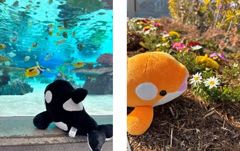 オルカくじ・ドルフィンくじの“推し”カラーのぬいぐるみと一緒に、館内・館外のスポットで写真を撮影してInstagram/X に