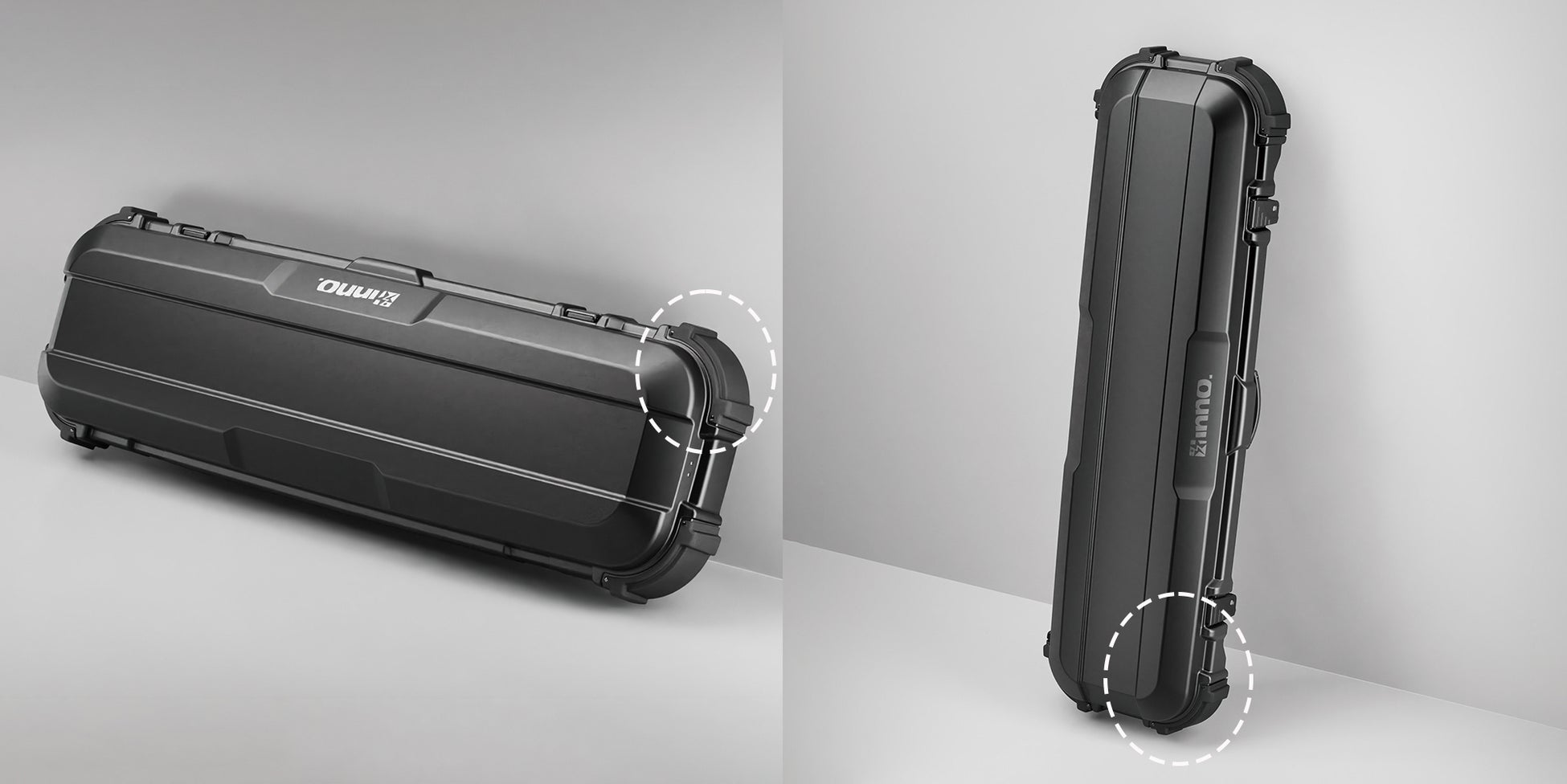 一般的な流線型ルーフボックスは、立てかけて保管することができません。本製品は、スクエア形状と四つ角にある傷防止バンパーにより、車に装着しない時には、横向き・縦向きどちらにも立てかけて保管することが可能です。バンパーは、傷が目立ちにくくなるよう粗いシボを採用したことで、デザインにもメリハリを効かせています。