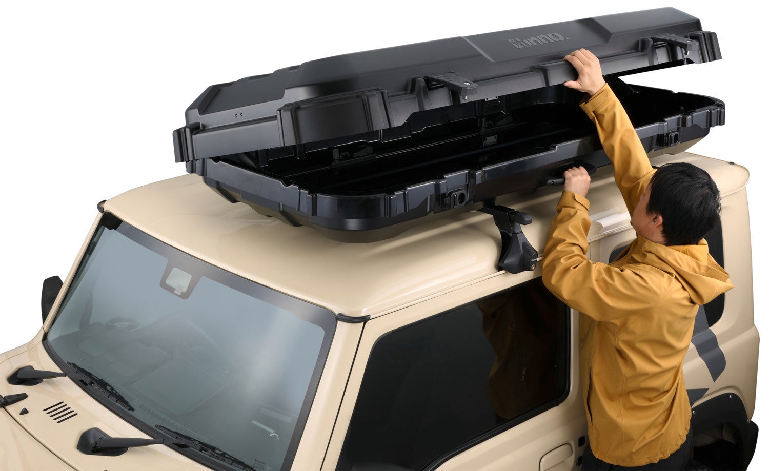 これまでの流線型やシンプルなデザインのルーフボックスとは異なり、クロカンSUVの車両イメージに合わせて無骨なデザインに(下写真左)。凹凸を施したカバーによりボックスの強度を高めつつ、肉厚を抑えることで軽量化を実現。あわせて堅牢さと力強さを演出します。