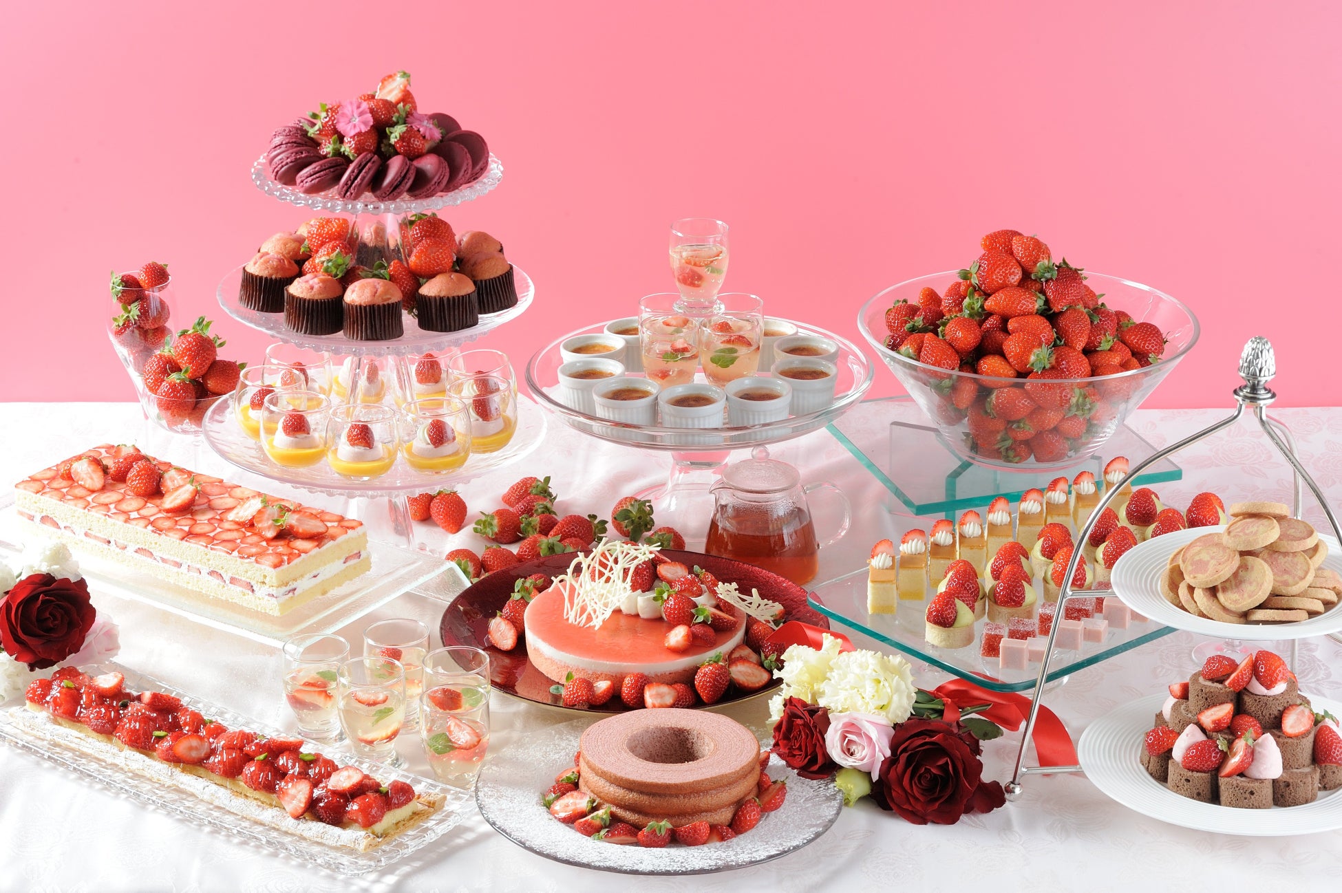 ホテル最上階からのスカイビューが広がる空間で、「苺の魅力を味わい尽くす」というコンセプトのもと、苺を主役としたブッフェをご用意。大人からお子様まで、幅広い年代の皆様に心ゆくまでお楽しみいただけるよう、彩り豊かな苺スイーツと充実したセイボリーをご提供いたします。