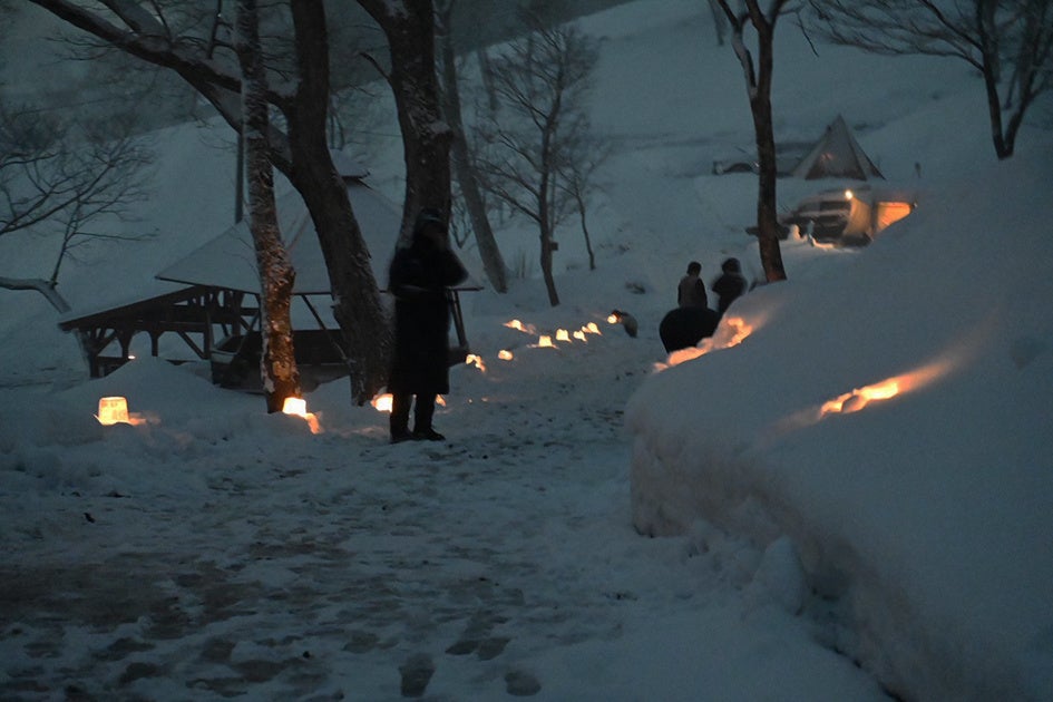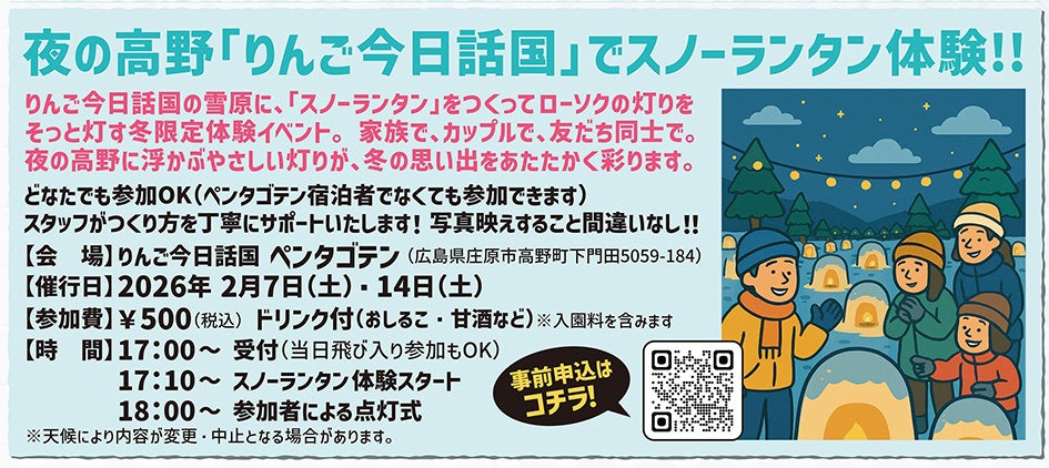 高野・スノーランタン体験:「りんご今日話国」にて、雪で作ったランタンにローソクを灯すイベントを開催。ペンタゴテンの明かりとランタンの光が共演する、幻想的な夜のひとときを演出します。