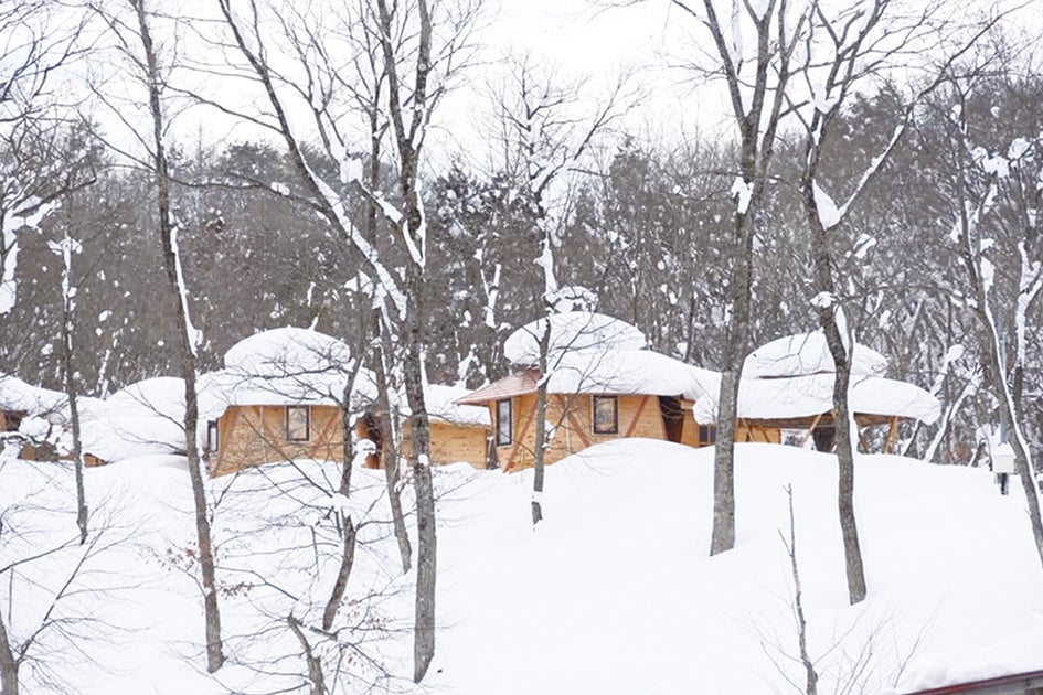 雪景色の中に浮かび上がるスタイリッシュなペンタゴテンは、寒さを防ぎながら冬の自然をダイレクトに感じるプライベート空間を提供します。