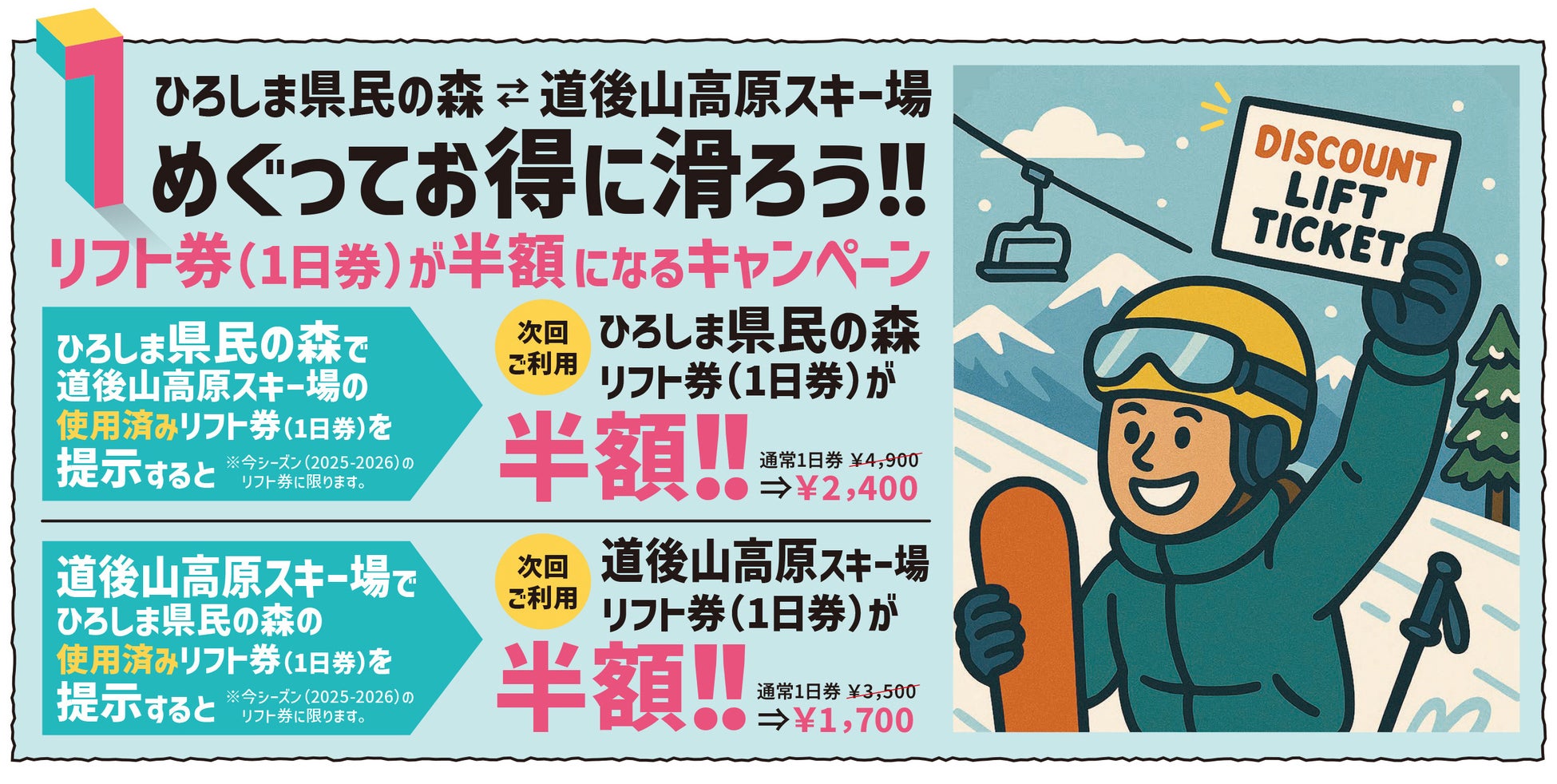 ※使用済みのリフト券(1日券)1枚につき、半額特典の適用は1回のみとなります。