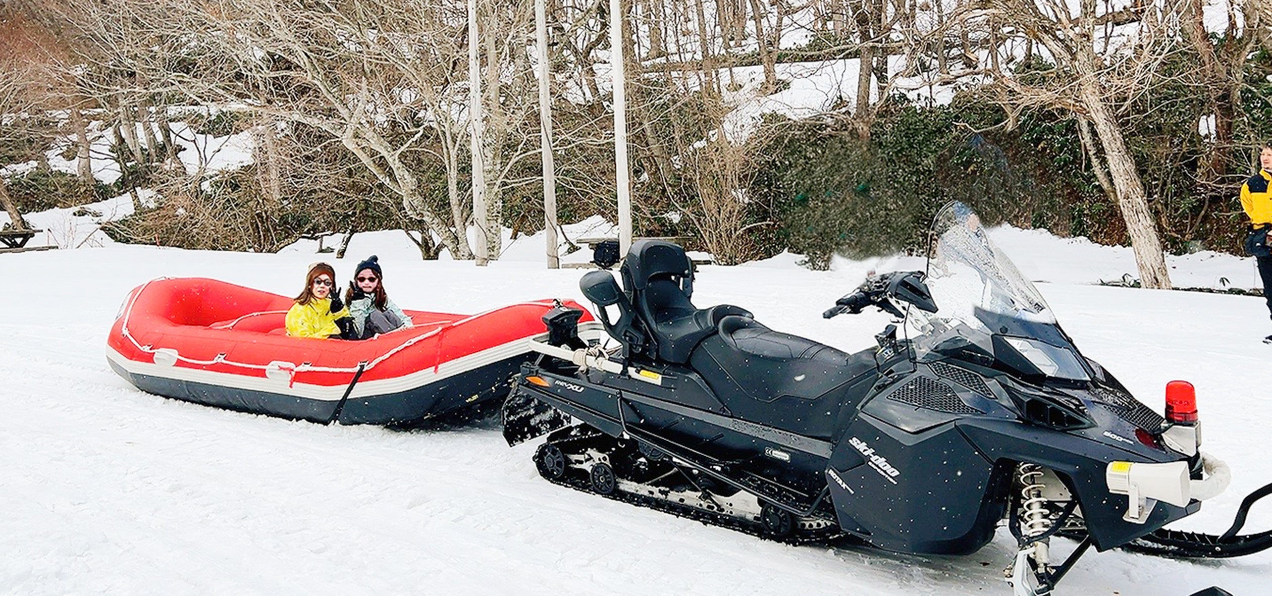 「プチ」スノーラフティング&モービル・リフト移動:集合場所からゲレンデまではゴムボートでの「プチ・ラフティング」。さらに山頂付近へはスノーモービルやリフトで一気にショートカット。移動中のワクワク感が期待を高めます。
