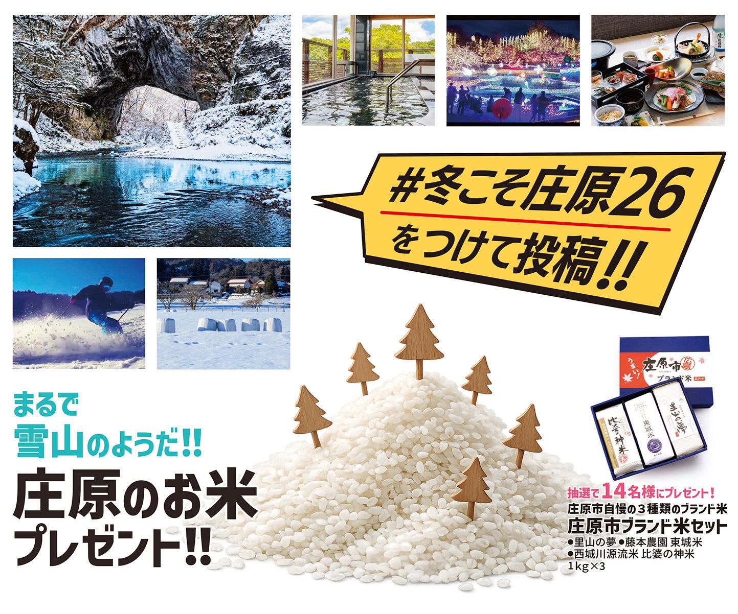 「#冬こそ庄原2026」Instagram投稿キャンペーン: 庄原の冬の「今」をInstagramへ投稿することを呼びかけています。投稿いただいた方の中から、抽選で「庄原のブランド米」をプレゼント!