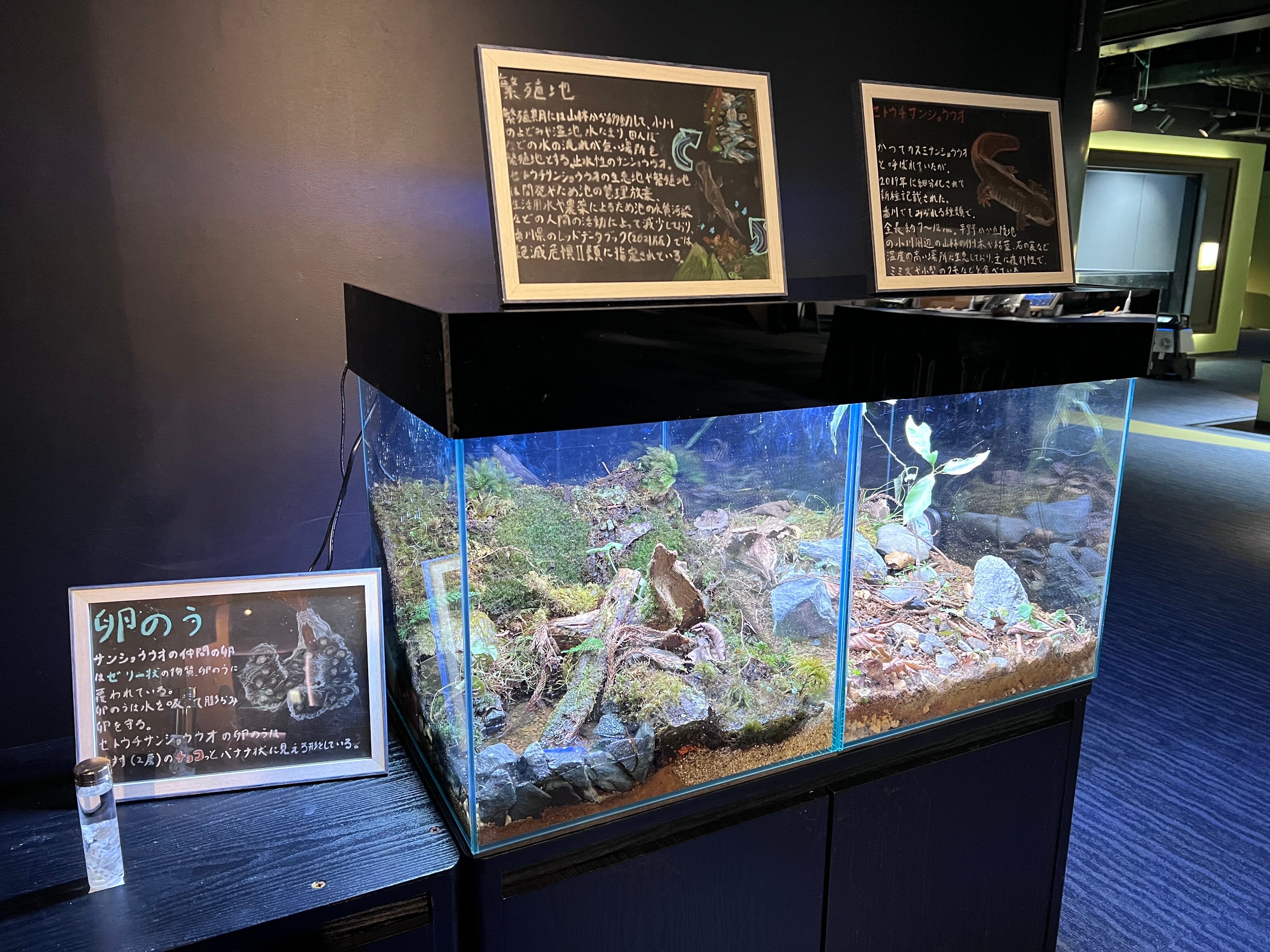 今回の企画展では、セトウチサンショウウオの繁殖期と非繁殖期の生息環境を再現した水槽レイアウトや解説パネルを通して、セトウチサンショウウオの魅力を色々な角度から紹介します。