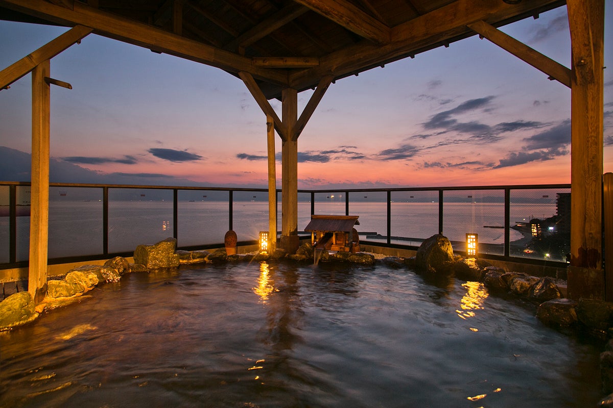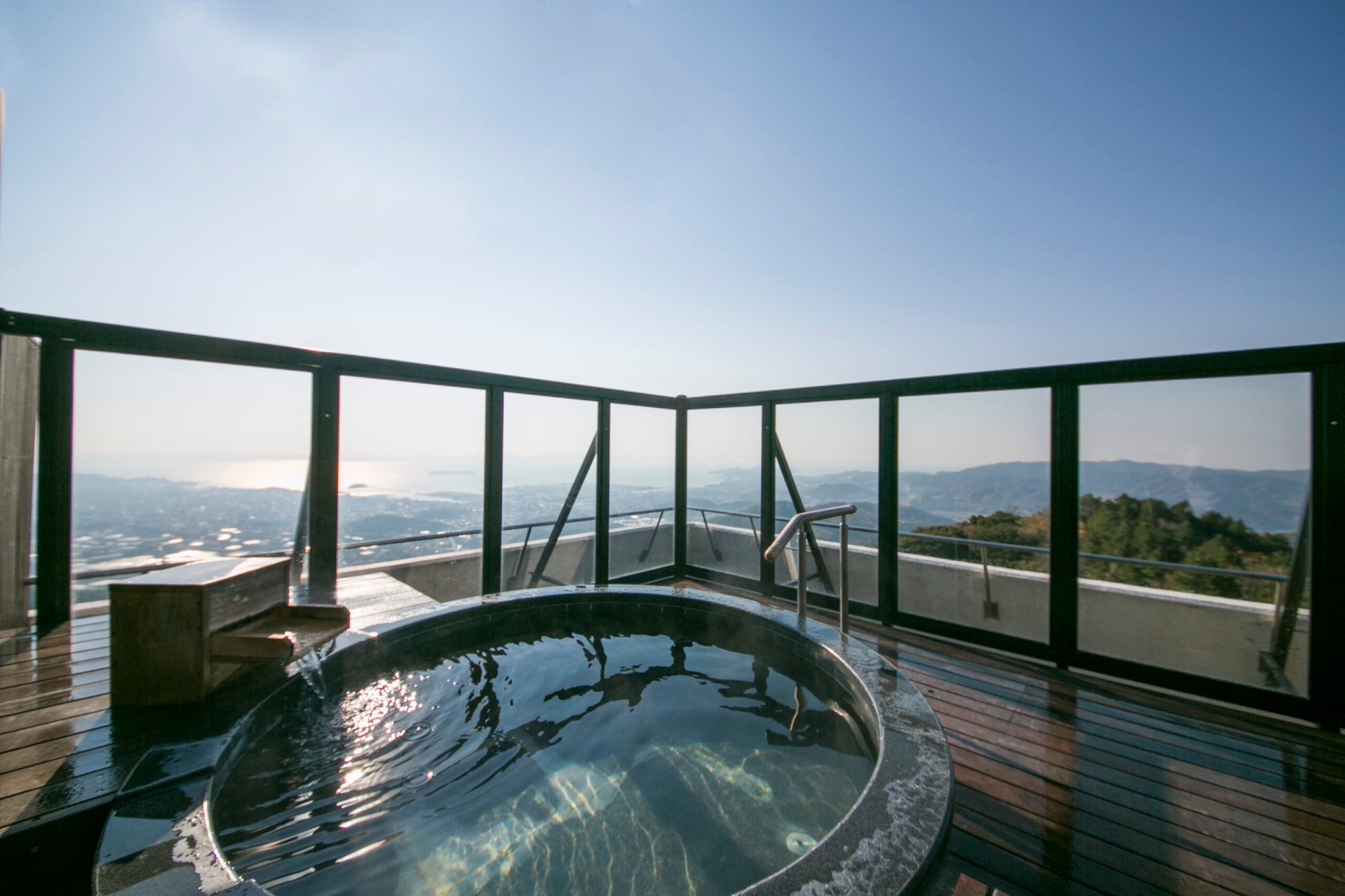 三河湾を望む絶景露天風呂や客室露天風呂のある旅館です。東に三河湾、西に名古屋方向を見下ろす山頂にございます。標高380mの解放感のある展望露天風呂からの景色は魅惑のスポットです。