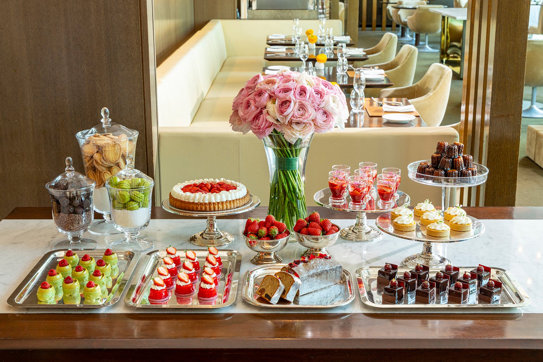 モダンフレンチを堪能する選べるメインディッシュと、季節の食材を使用したスイーツビュッフェは今までと同じスタイルにてご提供。リニューアルを飾るメイン料理には、素材の美味しさが際立つ「国産牛フィレのステーキ」、雛鳥を丸ごと焼き上げお客様の目の前でカットする「岩手県産雛鳥のロースト」、肉の風味とハーブのバランスが絶妙な「ラムチョップのロティ」、そしてスズキをふっくら香ばしく仕上げた「スズキのポワレ」の4種類からお選びいただけます。さらにビュッフェ台ではいちごを主役に、マカロンやカヌレなど伝統的なフランス菓子を加えた12種類のデザートがラインアップ。フレッシュいちごに始まり、タルトやムースなど、甘酸っぱく芳醇ないちごの風味が凝縮したスイーツが、食後を華やかに彩ります。